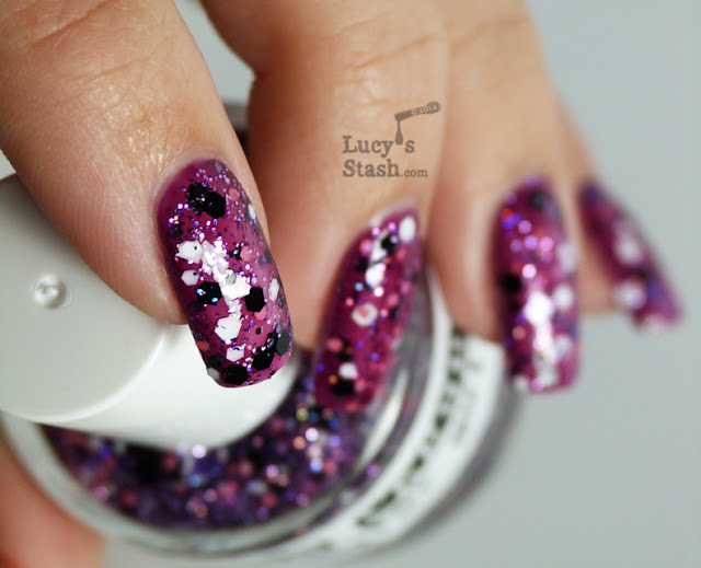 Let's get to the nail polish of the day. I couldn't resist and I finally purchased my first Lush Lacquers from their Etsy Store. This is one coat of Glitter Girl applied over topcoated China Glaze Split Perso-nail-ity. It consists of black and white glitter, small purple glitter and red&white squares. The formula was on the thicker side and there is A LOT of glitter in the bottle. I've had to use topcoat to get smooth surface as the glitter makes it uneven.